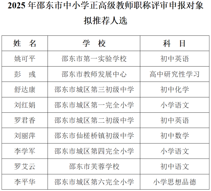 根据湖南省教育厅、湖南省人力资源和社会保障厅《关于做好2025年度全省中小学(含基层)正高级职称和省直中小学教师职称评审工作的通知》(湘教通〔2025〕156号)的精神,依照邵阳市教育局、邵阳市人力资源和社会保障局《关于做好2025年度邵阳市中小学正高级教师申报推荐工作的通知》的具体要求,综合各基层单位民主推荐上报情况,经研究,现确定姚可平等9名同志(名单附后)为2025年邵东市中小学正高级教师职称评审申报对象拟推荐人选,现予以公示。公示期限:2025年9月26日-10月9日。