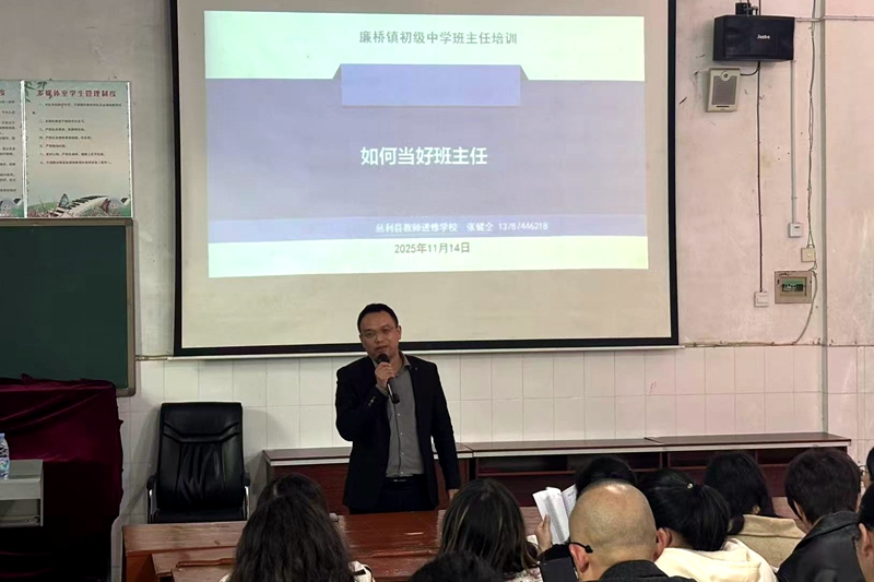 本网讯(通讯员 邓宇薇)为全面提升班主任队伍的专业素养与育人能力,近日,廉桥镇初级中学特邀知名教育专家、张家界市慈利县教师进修学校教师发展处主任、张家界市首批名师张健全,为全校教师带来了一场题为 “如何当好班主任” 的专题讲座。讲座围绕班主任的角色定位、工作意义与实践策略三大维度展开,内容翔实、案例生动,为全体教师提供了宝贵的经验借鉴与思想启发。​