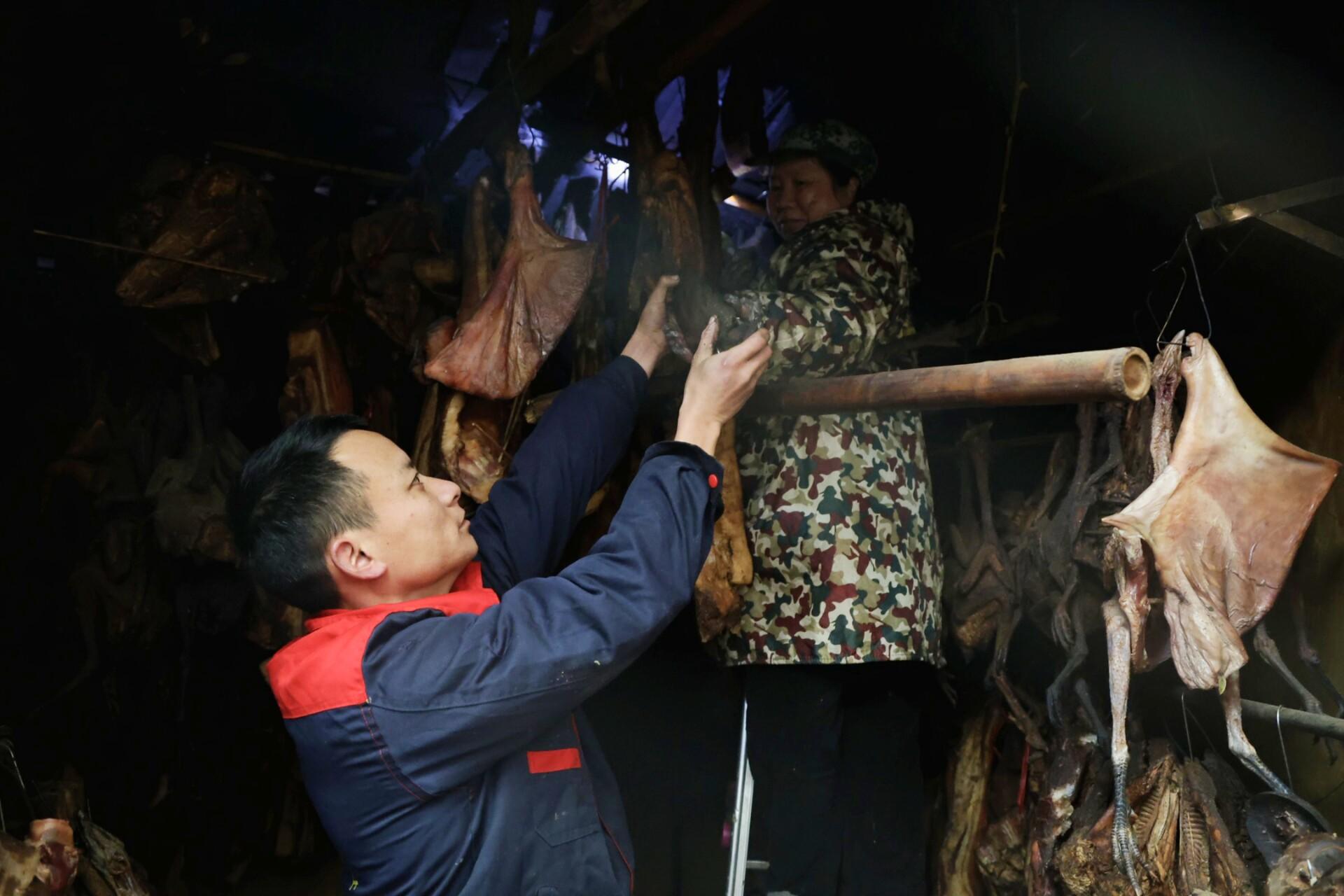 隆冬时节,走进冰糖村博奕种养专业合作社的养殖基地,成群的藏香猪与黑土猪在山坡上自由觅食,毛色光亮、体质健壮。合作社负责人戴建华正和员工一起,将刚从田间采收的萝卜、白菜等投喂给猪群。另一边的屠宰区里,工人们正有条不紊地进行土猪宰杀处理。这些新鲜猪肉一部分直接销往市场,另一部分则被加工成腊肉、香肠、猪血丸子等风味腊制品,以满足不同消费者的需求。